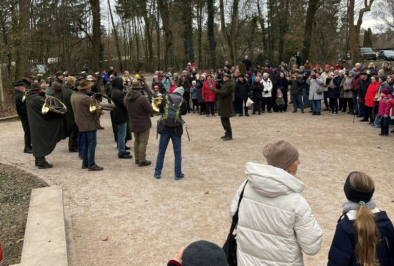 11 Jagdhornbläserinnen und Jagdhornbläser der Jägervereinigung Usingen unterstützten auch in diesem Jahr unsere Bläserfreunde vom Sachsenhäuser Jagdklub bei ihrem traditionellen Neujahrsblasen vor dem hölzernen Goetheturm. Die musikalische Leitung übernahm Max, von Schrot und Horn aus Kleinauheim, da der Sachsenhäuser Hornmeister im Urlaub weilte. Er erklärte humorvoll den zahlreichen Zuhörern den Sinn und Zweck des Jagdhorns.